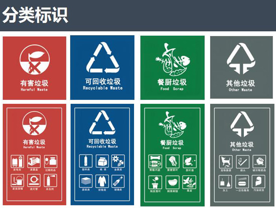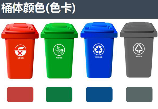 按照相關(guān)國家標(biāo)準(zhǔn),《規(guī)范》將生活垃圾分為有害垃圾、可回收垃圾、餐廚垃圾、其他垃圾四類,在分類收集、運(yùn)輸、處理生活垃圾的過程中均采用國標(biāo)規(guī)定的分類垃圾桶與標(biāo)志色。