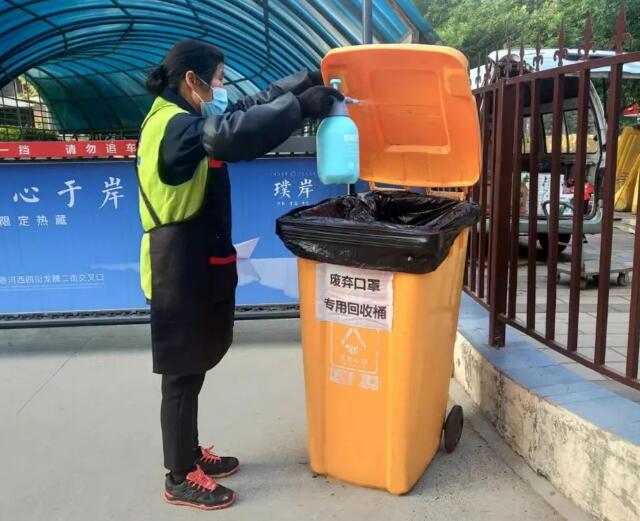 “您好,疫情期間投放垃圾請您自覺佩戴好口罩?!痹陉柟獬切^(qū),垃圾分類督導(dǎo)員正對前來投放垃圾的居民進(jìn)行進(jìn)一步的提示和指導(dǎo)。在每日上崗前,垃圾分類督導(dǎo)員都會洗手消毒,佩戴好口罩、手套,在保護(hù)好自身的同時,對小區(qū)各個垃圾分類投放點進(jìn)行全面徹底消毒,做到不留死角,對垃圾房里里外外、仔仔細(xì)細(xì)進(jìn)行清洗,不放過任何一個角落,還對垃圾房進(jìn)行消殺,扎實落實消毒工作,堅決防止疫情的擴散傳播,讓社區(qū)群眾有一個健康的城市生活環(huán)境。另外在小區(qū)明顯處還設(shè)置了廢棄口罩專用桶,倡導(dǎo)居民使用過的廢棄口罩和防護(hù)用品要投放到專門的收集桶內(nèi)。