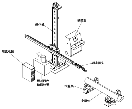 小筒體埋弧焊接專機主要用于筒體內、外縱縫的自動焊接,主要結構由焊接操作機和電動滾輪架組成;操作機主要由立柱(包括提升機構、防墜落保險裝置及配重部件)、橫梁(包括齒條及橫梁驅動部件)、機頭等部件組成。電動滾輪架由一組主動滾輪架、一組從動動滾輪架和底座組成。