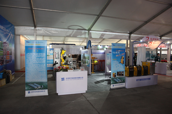 時代焊機作為職業教育領域的優秀焊接設備供應商應邀參加了本屆展會。展會的展位都設置在組委會搭建的臨時性展棚中,時代展臺的位置在C館的中央。展會中只有三家企業與焊接專業相關,時代是唯一一家專業焊接設備制造企業,其余兩家都是焊接模擬培訓儀的廠家。時代的展品以全新TD系列焊機集控系統、弧焊機器人設備為主。為了展示時代焊機的焊接教學系統解決方案,公司按真實尺寸1:1復制了焊接實操工位。工位里包括標準除塵系統、數字化焊接電源、焊機支撐架、多功能焊接操作架、監控探頭、氣瓶架及氣瓶、工具柜、槍掛鉤等,與真正的教學工位一模一樣。許多從事焊接教學工作的校長、老師對時代焊接實操工位很感興趣,大家仔細觀摩并詢問了不少細節問題。大家紛紛評價時代的工位實物展示全面細致,令人耳目一新。工位外四套時代焊機聯網組成的集控系統同樣吸引了大家的目光,老師們紛紛詢問該系統在實際教學和生產中的實際意義和用途,對時代新型焊機的外觀也大加贊賞。最吸引觀眾目光的還是時代弧焊機器人系統,本次展示包括機器人本體和小型變位機一套。機器人配合變位機焊接零件的過程,動作靈活準確。為了強化展出效果,展臺上布置了兩盞大功率的射燈將機器人照亮,耀眼的燈光將時代機器人高精度、高智能的風范勾畫得淋漓盡致。老師們對機器人的價格十分關心、同時還咨詢了不少教學系統編程問題。