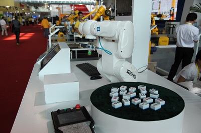 該系統(tǒng)由TIME R3-660時代工業(yè)機器人配置視覺識別系統(tǒng)組成,實現(xiàn)了視覺抓取、搬運的輕松化。整套系統(tǒng)采用高效的圖像識別算法,能夠?qū)ψト∥镞M行特征識別和位置定位。此款機器人在展會現(xiàn)場快速移動識別棋牌,小巧精美的形象甚得觀眾的喜愛。