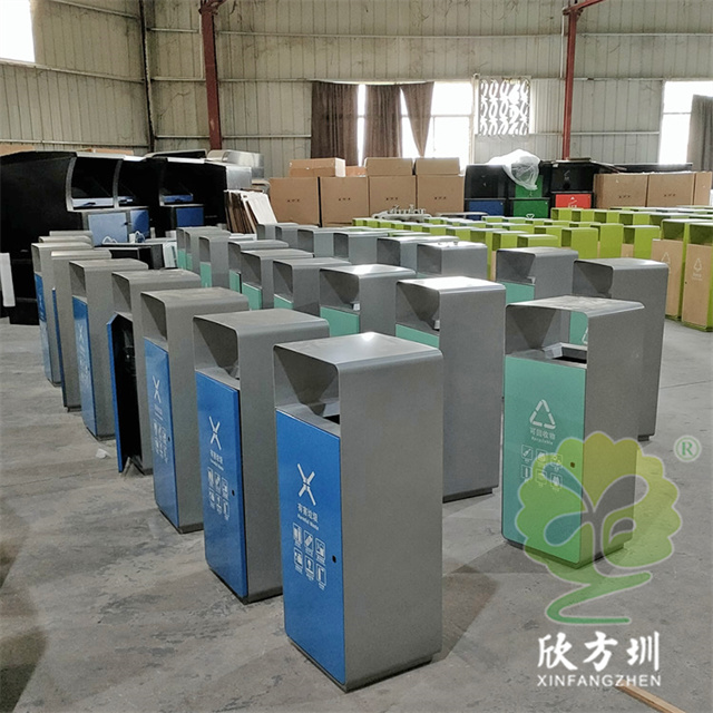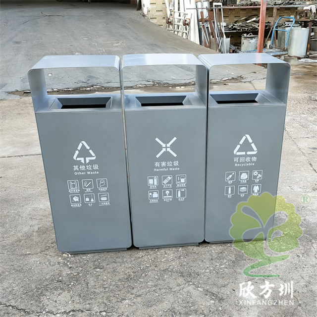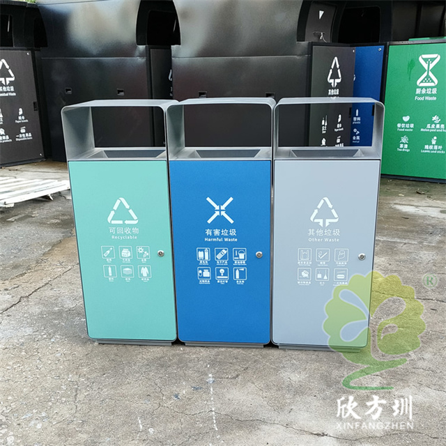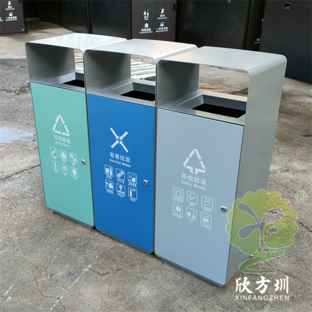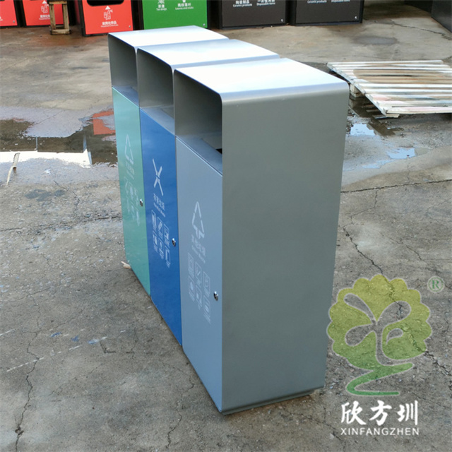 室外加厚組合三色不銹鋼分類果皮箱使用了201#不銹鋼板制作,外部框架采用了2.5mm厚,桶身采用了1.0mm厚的不銹鋼板裁剪折彎制造,單筒雙面?zhèn)让嫱犊诜叫卧O(shè)計,可以任意自由組合分類,外部框架噴塑灰色,門板正反面噴塑了不同的顏色,可回收物噴塑淡藍(lán)色、有害垃圾噴塑天藍(lán)色、其他垃圾噴塑了淡灰色,可以組合制作兩分類、四分類、五分類。
