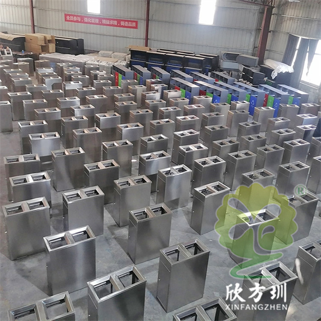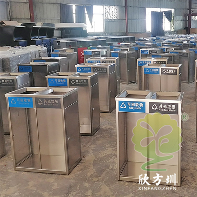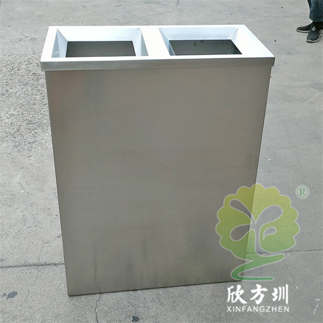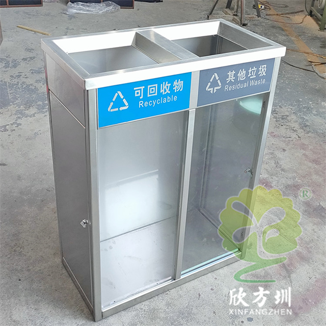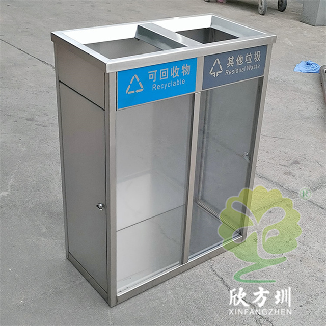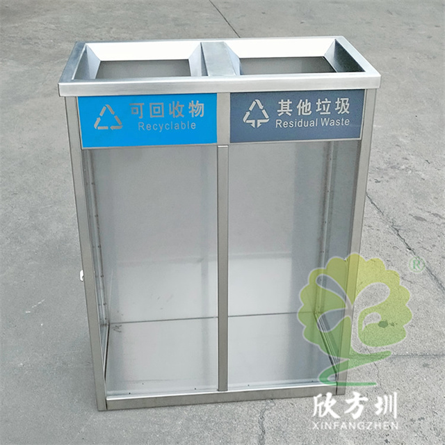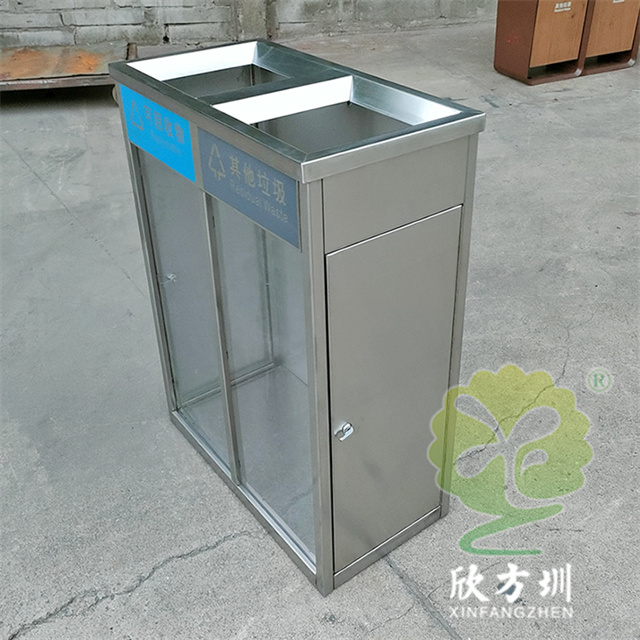 室內(nèi)兩連體防爆透明不銹鋼分類垃圾桶整體材質(zhì)采用了1.5mm厚(足1.42mm)生產(chǎn),直投口立式方形兩連體分類設(shè)計,表面不銹鋼本色啞光,正面上方橫條油墨絲印可回收物和其他垃圾國標(biāo)分類標(biāo)識,左右兩邊使用了扭鎖方便取出垃圾袋,無需要內(nèi)筒直接套塑料透明垃圾袋使用,桶底部加四個腳膠墊這樣有效避免挪動發(fā)出聲響。