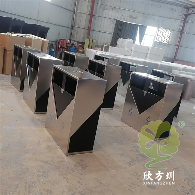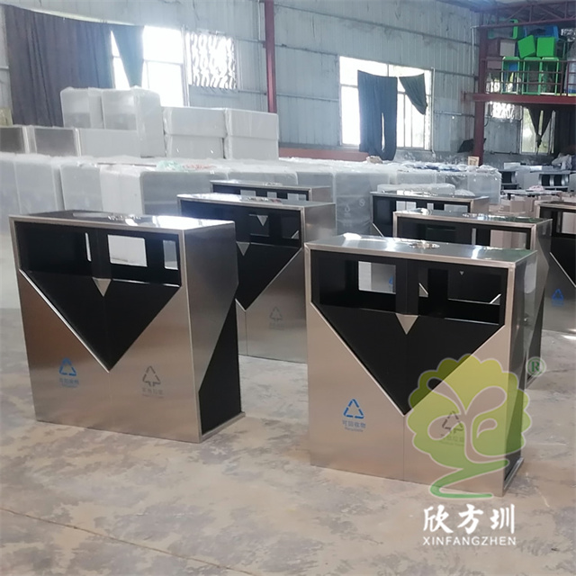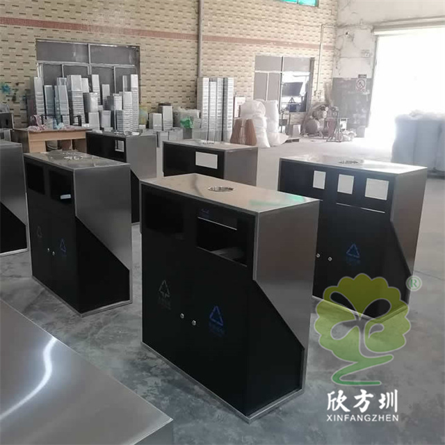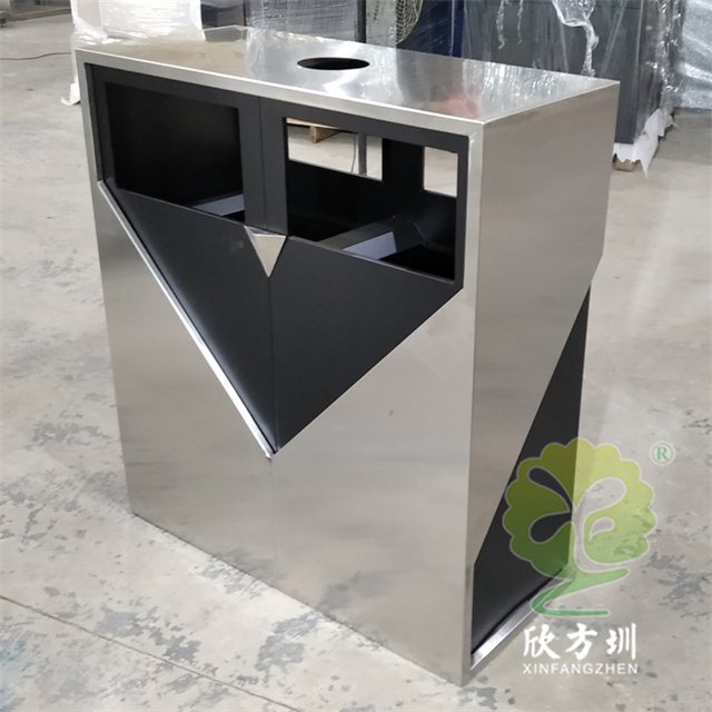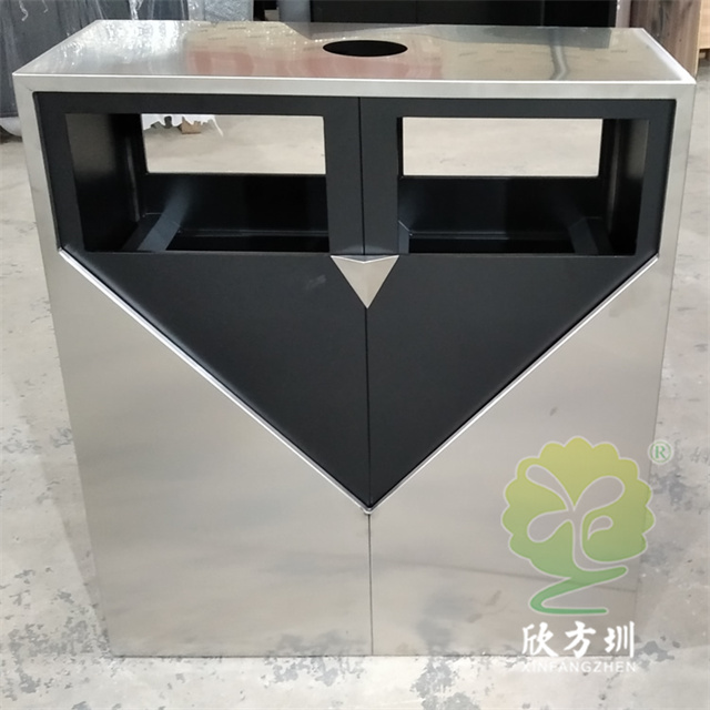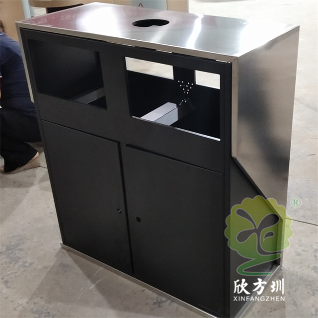 戶外小區(qū)噴塑不銹鋼分類垃圾桶采用了304不銹鋼板1.0mm制造而成,室外兩連體方形設(shè)計(jì),創(chuàng)意框架雙層雙層不銹鋼,內(nèi)側(cè)不銹鋼黑色噴粉,頂部帶個(gè)煙灰盅,背面三角鑰匙雙開(kāi)門(mén)可以取出內(nèi)筒,正面絲印單色國(guó)標(biāo)分類標(biāo)識(shí)。